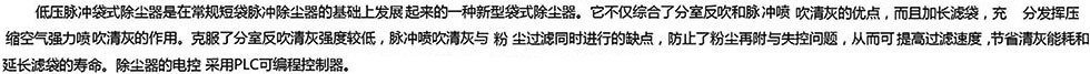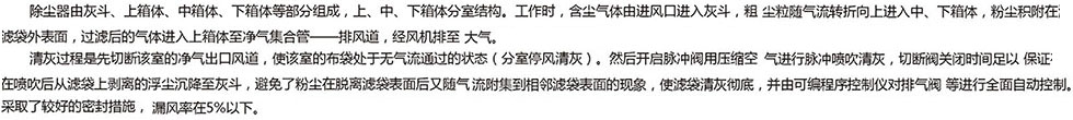 含塵氣體由進(jìn)氣口進(jìn)入灰斗、或通過敞開法蘭口進(jìn)入濾袋室,含塵氣體通過除塵器濾袋過濾為凈化氣體進(jìn)入凈氣室,再經(jīng)凈氣室排氣口,由風(fēng)機(jī)排走。粉塵積附在濾袋的外表面,且不斷增加,使袋式除塵器的阻力不斷上升,為使設(shè)備阻力不超過1200Pa,袋除塵器能繼續(xù)工作,需定期清除濾袋上的粉塵,清灰是由PLC程序控制器定時順序起啟動脈沖閥,使氣包內(nèi)壓縮空氣(0.5-0.7Mpa)由噴吹管噴出(稱一次風(fēng))通過文氏管誘導(dǎo)數(shù)倍于一次風(fēng)的周圍空氣(稱二次風(fēng))進(jìn)入濾袋使濾袋在瞬間急速膨脹,并伴隨著氣流的反向作用力抖落粉塵,達(dá)到清灰的目的。